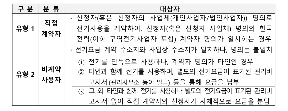 - 한국전력 또는 구역전기사업자와 신청자 혹은 신청자의 사업자 명의로 전기사용 계약을 체결하여야 신청이 가능합니다.