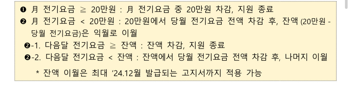 대상자 통보 후 최초로 발행되는 24년 고지서상 청구되는 전기요금 부터 최대 20만원 차감이 됩니다.
